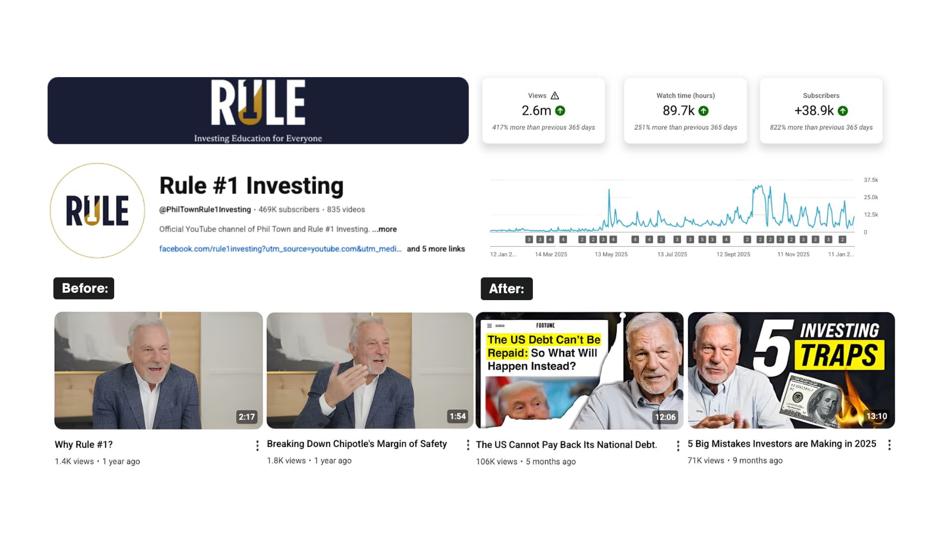 There was demand for what Phil teaches — but YouTube wasn't capturing it at scale. In the 12 months before working with us, the channel lost 3,500 subscribers. The content existed. The system didn't.